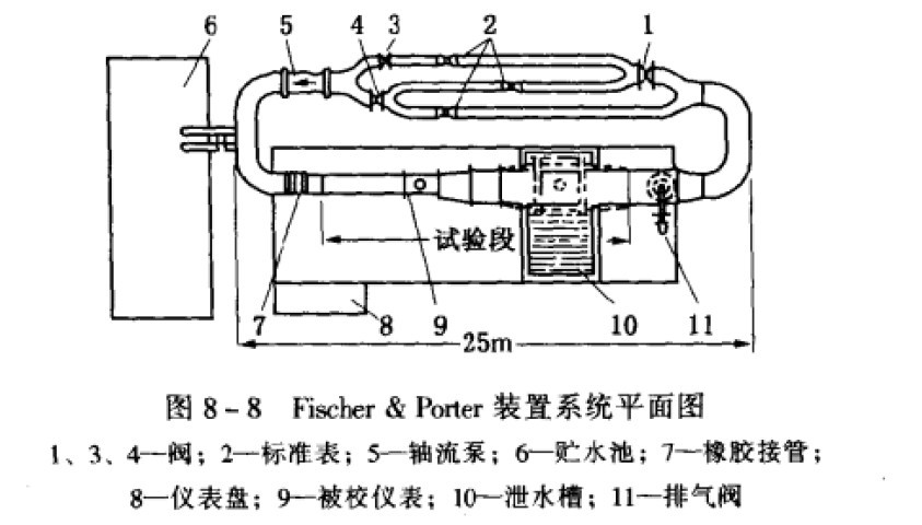 儀表制造廠早在工廠內部采用這種高效率的校準方法。圖8-8所示是Fischer+ PoIter公司的閉合循環(huán)回路標準流量計校準裝置系統平面圖。3只較小口徑的標準流量計2按所需流量分別以單只(閥4開,閥l、3關),2只并聯(閥1、4開,閥3關).3只并聯(閥l、3、4開)三種方式接人循環(huán)回路。標準流量計也可以3只串聯地接人同路(閥3開,閥1、4關)作相互間核對??尚首畲罂趶綖?m的電磁流量計,由于所需揚程只要2m,軸流泵5的功率只有70kw.最大流量為6000m3/h。