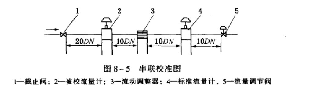 圖8-5所示是通用的一臺標準流量計(通常為渦輪流量計或電磁流量計)與技校準流量計串聯校準圖。