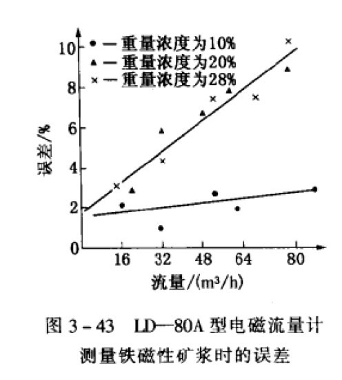 測量鐵礦漿時,隨著礦砂濃度不同,會出現(xiàn)不同的測量誤差。圖3 - 43是用ID - SOA型電磁流量計測量鐵磁性礦漿流量時的偏差曲線[5。從圖中可以看出,用般電磁流量計來測量含有鐵磁性礦漿流量時,指示值要比實際值高,即產(chǎn)生正偏差。并且,產(chǎn)生的偏差與礦漿的濃度有關(guān),也就是說,與鐵磁性的含量有關(guān)。當(dāng)?shù)V漿質(zhì)最濃度為28%時,最大偏差達+ 9.8%。下面我們從原理分析造成測量誤差的原因