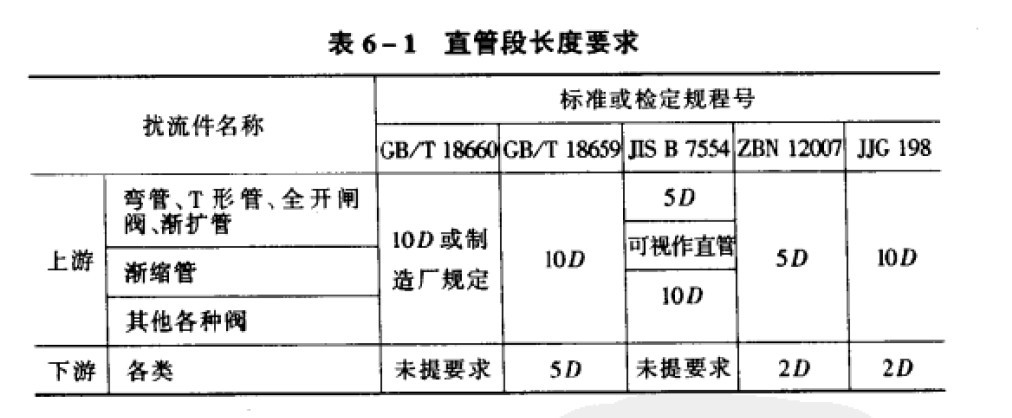各標(biāo)準(zhǔn)或檢定規(guī)程所提出的上下游直管長度亦不一致,忙總?cè)绫?-1。大部分均比通常儀表制造廠提出的要求高,這是為了保證達(dá)到0.5級精度等級儀表的要求