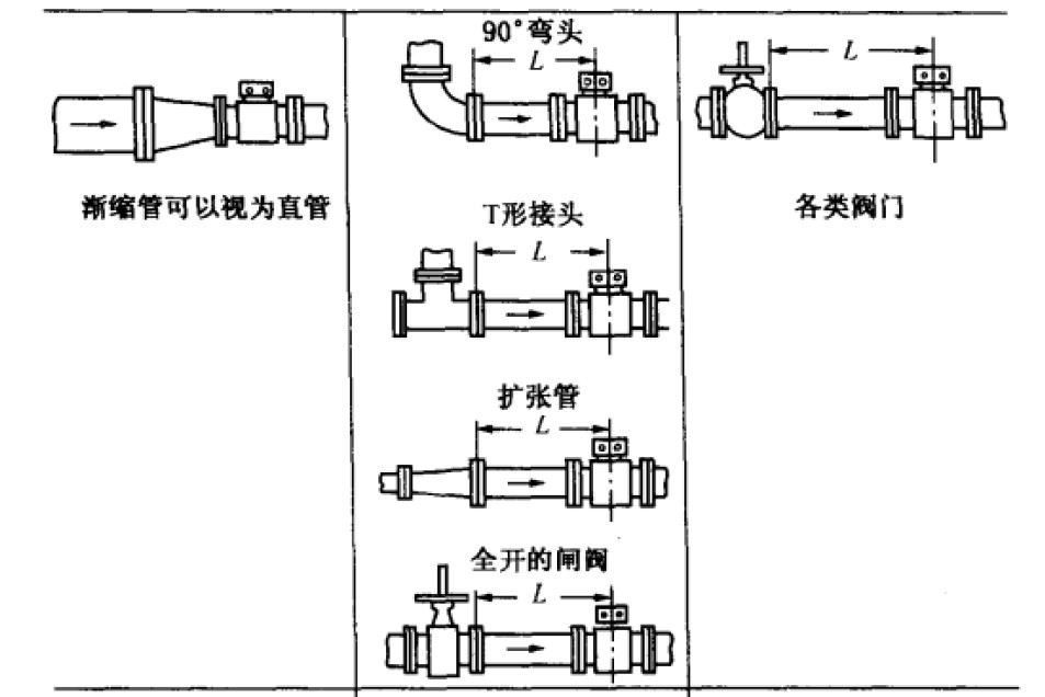 小口徑電磁流量計(jì)傳感器和有些中口徑傳感器從電松中心到測量管進(jìn)口端距離(L)已相當(dāng)丁幾倍直徑(D)長的直管段,這樣即使傳感器進(jìn)口端前的流體流動是非軸對稱流,測量也不會受什么影響。但是,隨著儀表口徑的增大及傳感器結(jié)構(gòu)的改進(jìn),L/D值愈來愈?。畟鞲衅鳒y量管本身組成的直管段已不足以使非軸對稱流“對稱化”。所以,電磁流量傳感器有上游置直管段的要求。