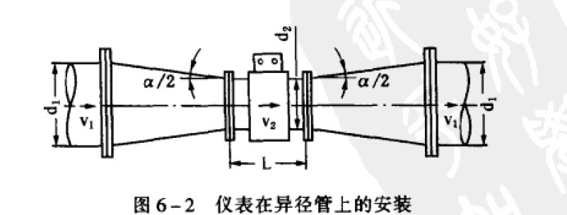 JIS B 7554-1993提出常用的傳感器上游側(cè)直管段的布置如圖6-1。在傳感器口徑與工藝管道口徑不一致時(shí),可采用異徑管過渡。如圖6-2。