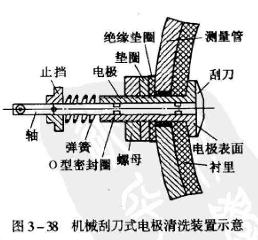 一種是采用機械刮除器。用不銹鋼制戚一把帶有細軸的刮刀,通過空心電極把刮刀引出,細軸和空心電極之間采用機械密封以防止介質外流,于是紺成了機械刮除器。當從外面轉動細軸時,刮刀緊貼電極端平面轉動,刮除污垢。這種刮除器可以手動,也可以用馬達驅動細軸自動刮除