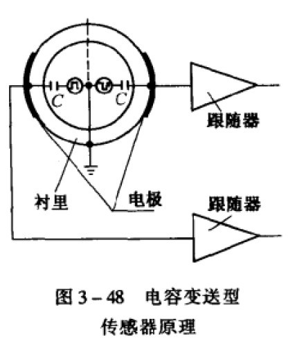 把弧形電極緊貼襯里的外壁,使被測(cè)流體與電極不接觸,這樣能從根本上解決電極的腐蝕、污染、泄漏以及產(chǎn)生漿狀流體噪聲的問(wèn)題。電容變送傳感器的流量信號(hào)是通過(guò)電極與被測(cè)流體間形成的電容耦合傳輸?shù)睫D(zhuǎn)換器,如圖3 - 48所示的這種結(jié)構(gòu)就是電容式電磁流量計(jì)的基本結(jié)構(gòu)。所以,電容式電磁流量計(jì)也稱無(wú)電極電磁流量計(jì) 為了增大耦合電容的容量,減少流量信號(hào)在容抗上的損失,通常采用大面積電極或多電極結(jié)構(gòu),并滿足式(3 - 16)的要求,提高轉(zhuǎn)換器的輸入電阻R到lOizfl以上。 尺In≥2(3-16)