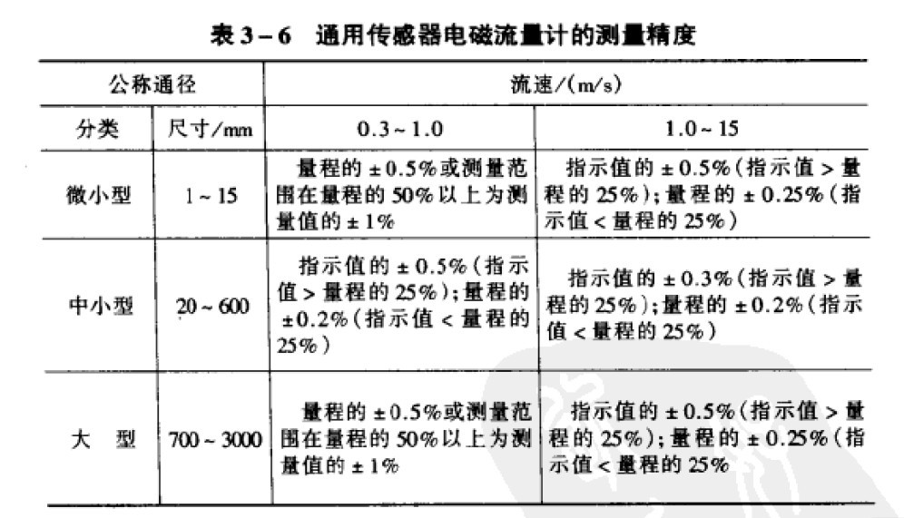 我們把用于封閉管道充滿流體介質(zhì)測量的電磁流量傳感器稱為通用傳感器。近年新發(fā)展的電容式電磁流量計和電磁式水表另外介紹。通用傳感器產(chǎn)品口徑可以從Imrn到3m。如此大范圍不同的口徑,給流量計結(jié)構(gòu)與性能帶來了一些差別,其性能差別主要反映在測量精度方面。表3-6列出現(xiàn)代典型通用傳感器電磁流量計的測量情度等級指標。