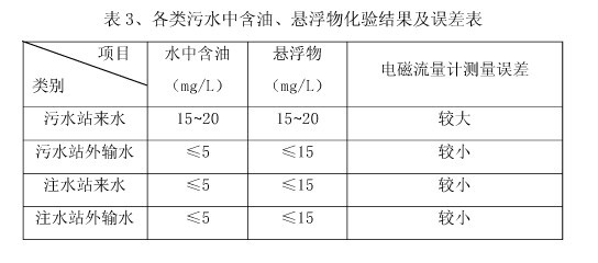 在電磁流量計的安裝情況、環(huán)境溫度及污水本身蒸發(fā)損耗等方面基本相同的情況下,我們對污水站、注水站各類污水的水質(zhì)情況進(jìn)行了對比分析:
