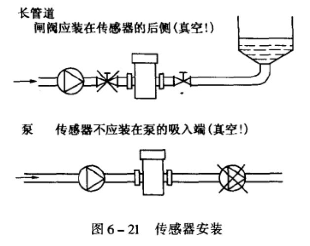 川聚四氟乙烯( PTFE)管材做的電磁流量傳感器襯里,它與傳感器測(cè)量管管壁一般不粘貼,因此,對(duì)真空負(fù)壓是敏感的。管道內(nèi)真空會(huì)抽癟聚四氟乙烯襯里,使電磁流量計(jì)襯里呈波浪型拱起——典型的負(fù)壓破壞形態(tài),這樣破壞了電極的密封,傳感器就不能工作了。因此,PTFE襯里的傳感器不能用于負(fù)壓系統(tǒng),也應(yīng)盡可能避免安裝在可能產(chǎn)生瞬間負(fù)壓的地方。如傳感器不應(yīng)裝在泵的吸人端;閘閥應(yīng)裝在傳感器的后側(cè),如圖6 - 21所示,有些PTFE襯里的傳感器可承受一些負(fù)壓,但與被測(cè)介質(zhì)溫度有關(guān)。因此,電磁流量計(jì)在運(yùn)行時(shí)能經(jīng)受得住的溫度和真空度的最高值應(yīng)參閱各制造廠的說明書。