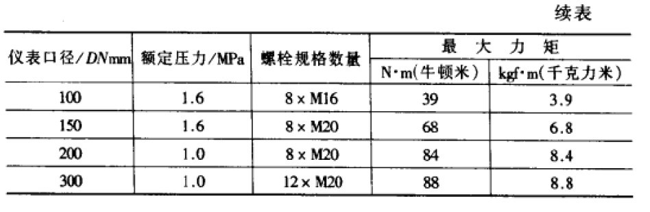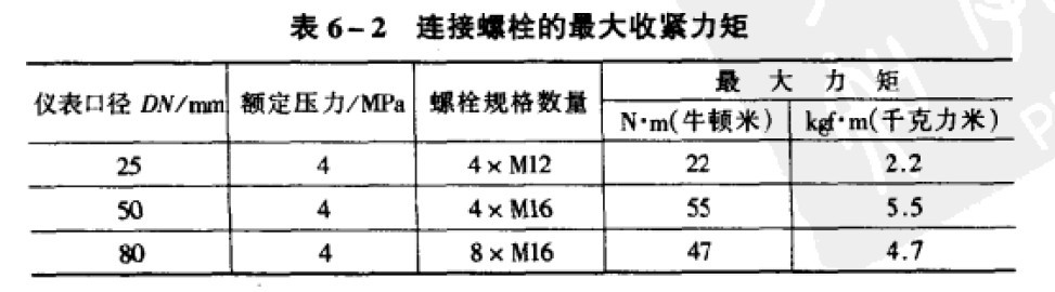 眾所周知.PTFE(冷態(tài))在壓力之下會(huì)變形。電磁流量計(jì)在安裝時(shí),法蘭螺栓不可無限制地任意擰緊。如果螺栓擰得過緊,則PTFE蠕變會(huì)使法蘭連接處發(fā)生滲漏,因此連接螺栓應(yīng)該使用力矩板手上緊,連接螺栓最大收緊力矩應(yīng)按制造廠說明書規(guī)定;表6-2為一例,可作參考。