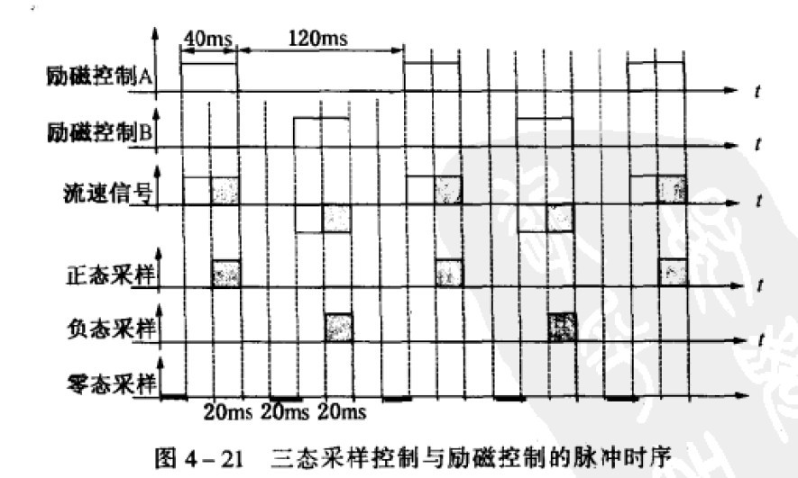 從圖中波形還可以看到,不管是正向采樣還是反向采樣,采樣脈沖總是以流量信號(hào)的脈沖后沿為準(zhǔn)向前采樣,采樣脈沖寬度為交流電源的一個(gè)周期(這里是20ms)。