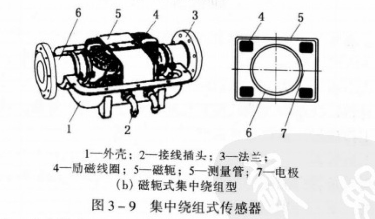 圖3 -9( b)是磁軛式集中繞組型。這種結(jié)構(gòu)的勵(lì)磁線(xiàn)圈是在測(cè)量管的上、下各安裝一只無(wú)骨架的馬鞍形線(xiàn)圈,線(xiàn)圈的外側(cè)采用多層電工硅鋼片制成磁軛代替“E型鐵芯,并且在線(xiàn)圈中間部分平行安裝兩塊導(dǎo)磁體作為磁檄,產(chǎn)生的磁場(chǎng)比較均勻,這種勵(lì)磁結(jié)構(gòu)比較適合于中小口徑的傳感器。