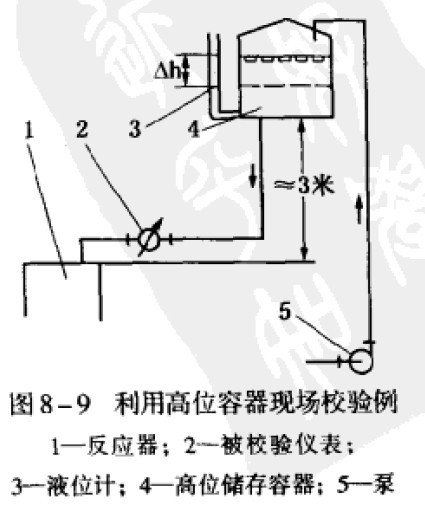 生產(chǎn)過(guò)程中往往在流量?jī)x表上游側(cè)有高位儲(chǔ)存容器,或在下游側(cè)有存儲(chǔ)槽池,在丈量其尺寸求得體積后可用來(lái)校準(zhǔn)儀表。圖8-9所示是利用上游側(cè)高位儲(chǔ)存容器進(jìn)行校準(zhǔn)一例。硫酸由泵5打人容器4,到一定體積后停止,從底部流出,經(jīng)電磁流量計(jì)2后進(jìn)入反應(yīng)器1:丈量得容器各段,從玻璃管液位計(jì)3觀察容器內(nèi)液位,便可知道容器內(nèi)酸液的流出量。在同一段時(shí)間間隔內(nèi)讀取流量計(jì)指示流量和容器內(nèi)酸液流出餐計(jì)算出來(lái)的實(shí)際流量,比較之。也可以采用比較同一時(shí)間內(nèi)流量計(jì)的積算值和容器內(nèi)液體液出量。本實(shí)例試驗(yàn)一次10. 15min。