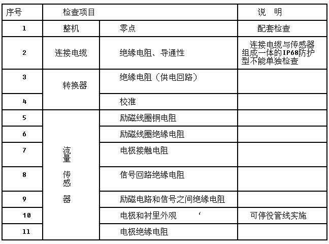 檢查信號(hào)電纜線與勵(lì)磁電纜線各芯導(dǎo)通和絕緣電阻;檢查各屏蔽層接地完好表8-2電磁流量計(jì)檢查項(xiàng)目