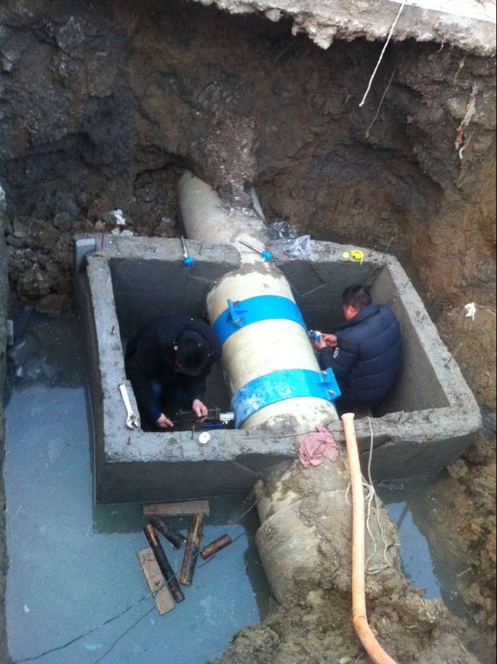華立超聲波流量計(jì)支持不停水在線安裝,管道清理干凈以后,工程師將卡箍固定在管道上。