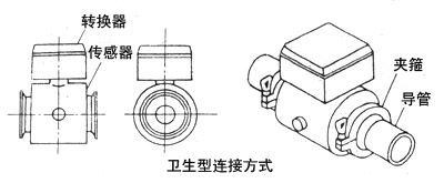 夾裝連接時(shí)近年發(fā)展的連接方式,傳感器本身無(wú)法蘭,以較長(zhǎng)的螺栓夾持在管道兩法蘭之間接入管系。本方式傳感器體積小重量輕,對(duì)于不同壓力規(guī)范和標(biāo)準(zhǔn)管系法蘭孔距適應(yīng)性強(qiáng);但只適用于較小管徑(200mm一下),承受液體工作壓力較低。