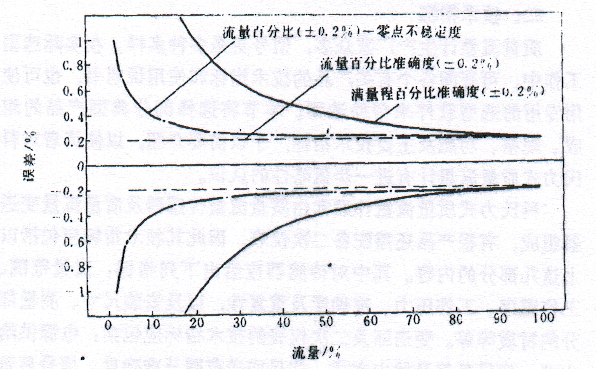 (3)帶零點(diǎn)不穩(wěn)定度的流量百分比準(zhǔn)確度:各流量點(diǎn)的測(cè)量誤差用流量百分比加零點(diǎn)不穩(wěn)定度來表示。圖3 -1是準(zhǔn)確度的三種表示方法對(duì)照示例圖。 漉量/l,;
