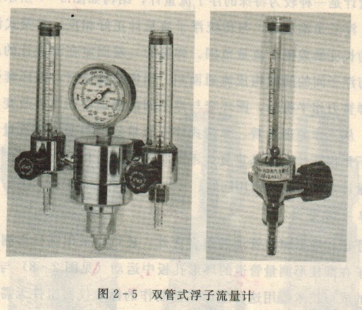 所謂雙管式浮子流量計,是指流量計有兩個透明管,透明錐管外層套有透明護(hù)套管,流量示值網(wǎng)印在護(hù)套管外壁上,而護(hù)套管內(nèi)壁與錐管外壁構(gòu)成氣體出口回路的一種浮子流量計(雙涵道浮子流量計是兩種流體介質(zhì),雙管式則是同一流體介質(zhì))。這類浮子流量計的錐管和護(hù)套管材料多為工程塑料。雙管式流量計的計量精度不高,主要起一種可見調(diào)量閥門的作用,以機(jī)械行業(yè)使用為主。例如,焊接工具上配備的帶減壓閥的浮子流量計,有的在浮子流量計人口處還設(shè)有加熱器,以消除由于降壓,導(dǎo)致降溫,氣體產(chǎn)生的結(jié)露。雙管式浮子流量計的測量介質(zhì)通常是氧氣、氬氣、二氧化碳等,流量計的人口壓力往往固定,出口多為流向大氣,典型產(chǎn)品如圖2-5所示。