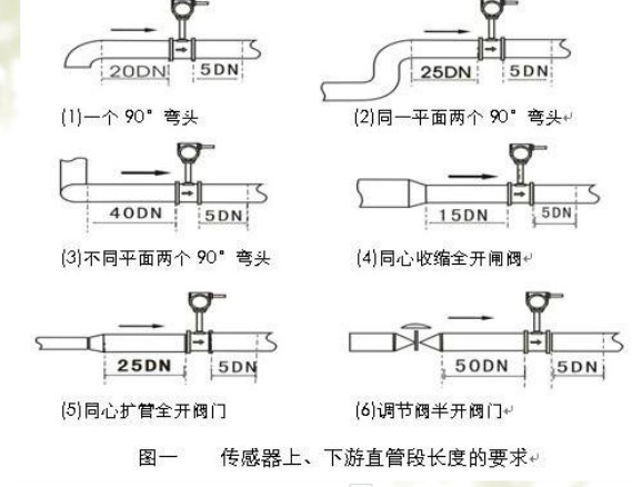 (1)安裝傳感器的直管段應盡可能的與傳感器通徑(DN)一致,若無法一致是應采用比傳感器通徑略大的管徑,誤差要小于等于3%并不超過5mm.