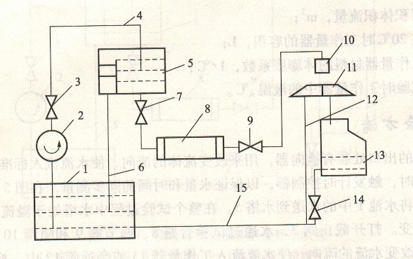 1—水池;2-7水泵;3一上水閥;4一上水管;s-水塔; 6-溢流管;7一截止閥;8一試驗(yàn)管路;9-流量調(diào)節(jié)閥;10 -噴嘴;11-換向器;12-旁通管;13-工作量器;14 -放水閥;15 -回水管