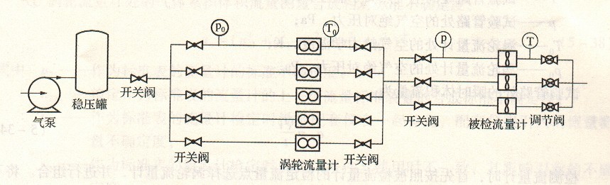 空氣流量標(biāo)準(zhǔn)裝置 1.結(jié)構(gòu) 以渦輪流量計(jì)作為標(biāo)準(zhǔn)表的空氣流量標(biāo)準(zhǔn)裝置(簡稱為空氣流量標(biāo)準(zhǔn)裝置)的典型結(jié) 構(gòu)如圖1所示,主要由氣泵、若干條管路、若干臺渦輪流量計(jì)、計(jì)時(shí)器和控制設(shè)備等組成。 圖1渦輪流量計(jì)為標(biāo)準(zhǔn)表的空氣流量標(biāo)準(zhǔn)裝置 渦輪流量計(jì)直接脈沖輸出,性能穩(wěn)定、重復(fù)性好、易于控制,因此,其作為標(biāo)準(zhǔn)使用在 標(biāo)準(zhǔn)表法空氣流量標(biāo)準(zhǔn)裝置上是可行的。 渦輪流量計(jì)前后直管段應(yīng)符合安裝要求。渦輪流量計(jì)應(yīng)在同樣流體條件的上一級空氣流 量標(biāo)準(zhǔn)裝置上檢定溯源。 2.工作原理 空氣流量標(biāo)準(zhǔn)裝置的基本原理是基于流體力學(xué)的連續(xù)牲方程。以m個(gè)渦輪流量計(jì)為標(biāo) 準(zhǔn)器,使空氣在某個(gè)流量下連續(xù)通過渦輪流量計(jì)和試驗(yàn)管路,此時(shí)渦輪流量計(jì)處的空氣累積 體積流量為 式中Kw-第w臺渦輪流量計(jì)的儀表常數(shù),m³; Nw——第w臺渦輪流量計(jì)的累積脈沖數(shù); Qvw——w臺渦輪流量計(jì)測量的體積流量,m³; Qvo——m臺渦輪流量計(jì)的累積體積流量,m³。 對每一臺渦輪流量計(jì),其儀表常數(shù)定義如下: 式中Q——某流量點(diǎn)渦輪流量計(jì)測量的體積流量,m3; N——某流量點(diǎn)渦輪流量計(jì)的累積脈沖數(shù); K——某流量點(diǎn)渦輪流量計(jì)的儀表系數(shù),1/m3。其值是檢定時(shí)該流量點(diǎn)多次檢定的算術(shù)平均值。 試驗(yàn)管路處的空氣累積體積流量為 式中 Qv —— 試驗(yàn)管路處的空氣累積體積流量,m³; Qw —— 渦輪流量計(jì)處的累積體積流量,m³; T—— 試驗(yàn)管路處的空氣熱力學(xué)溫度,K; p —— 試驗(yàn)管路處的空氣絕對壓力,Pa; To —— 渦輪流量計(jì)處的空氣熱力學(xué)溫度,K; Po —— 渦輪流量計(jì)處的空氣絕對壓力,Pa。 試驗(yàn)管路處的瞬時(shí)體積流量為 檢測流量計(jì)時(shí),首先按照被檢流量計(jì)的檢定流量點(diǎn)選擇渦輪流量計(jì),并進(jìn)行組合。將不 參與試驗(yàn)的渦輪流量計(jì)的上、下游閥門關(guān)閉,打開已選渦輪流量計(jì)的上、下游閥門,啟動(dòng)鼓 風(fēng)機(jī)使空氣流向已選渦輪流量計(jì)和被測流量計(jì)。然后,調(diào)節(jié)流量使流量達(dá)到試驗(yàn)流量點(diǎn)。流 量穩(wěn)定一段時(shí)間后,同時(shí)測量渦輪流量計(jì)的脈沖數(shù)和被測流量計(jì)輸出值。經(jīng)一定時(shí)間后,再 同時(shí)停止記錄渦輪流量計(jì)的脈沖數(shù)和被測流量計(jì)輸出值。比較兩者的流量值,從而確定被測 流量計(jì)的計(jì)量性能。 3.檢定 空氣流量標(biāo)準(zhǔn)裝置的檢定按JJG 643-2003《標(biāo)準(zhǔn)表法流量標(biāo)準(zhǔn)裝置》進(jìn)行。 (1)渦輪流量計(jì)的檢定 渦輪流量計(jì)按JJG1037-2008《渦輪流量計(jì)》中的方法進(jìn)行檢定。定點(diǎn)使用的渦輪流量 計(jì),檢定每個(gè)使用流量點(diǎn),每點(diǎn)檢定次數(shù)不少于6次。渦輪流量計(jì)的檢定結(jié)果,應(yīng)給出對應(yīng) 于各檢定流量點(diǎn)的儀表系數(shù)。 ①渦輪流量計(jì)儀表系數(shù)的相對標(biāo)準(zhǔn)不確定度 式中Uj-第j個(gè)檢定點(diǎn)的儀表系數(shù)的相對標(biāo)準(zhǔn)不確定度,%; Sk——第j個(gè)檢定點(diǎn)的儀表系數(shù)標(biāo)準(zhǔn)偏差,1/m³; Kj——第j個(gè)檢定點(diǎn)的儀表系數(shù)平均值,1/m³。 第w臺渦輪流量計(jì)的儀表系數(shù)的相對標(biāo)準(zhǔn)不確定度Uw: ②并聯(lián)m臺渦輪流量計(jì)按式計(jì)算m臺渦輪流量計(jì)的儀表系數(shù)的相對標(biāo)準(zhǔn)不 確定度U21: 式中 U21 —— 作為標(biāo)準(zhǔn)表的流量計(jì)的相對標(biāo)準(zhǔn)不確定度; qw —— 第w臺作為標(biāo)準(zhǔn)表的流量計(jì)的對應(yīng)流量,m³/h。 (2)空氣流量標(biāo)準(zhǔn)裝置的給出流量的相對不確定度 ①渦輪流量計(jì)處的氣體累積體積流量測量合成相對標(biāo)準(zhǔn)不確定度 式中U21 —— 作為標(biāo)準(zhǔn)表的流量計(jì)的標(biāo)準(zhǔn)不確定度; U22 —— 檢定作為標(biāo)準(zhǔn)表的流量計(jì)的上一級流量標(biāo)準(zhǔn)裝置的合成標(biāo)準(zhǔn)不確定度; U23 —— 作為標(biāo)準(zhǔn)表的流量計(jì)檢定時(shí)沒帶配套儀表一起檢定,配套儀表引入的流量測 量不確定度; U4 —— 怍為標(biāo)準(zhǔn)表的流量計(jì)檢定時(shí)的流體條件與使用時(shí)不一致,其影響引起的不確 定度; U25 —— 數(shù)據(jù)采集、信號處理、數(shù)據(jù)處理及通信不確定度所引起的流量測量不確定度。 ②渦輪流量計(jì)處的空氣瞬時(shí)流量的合成相對標(biāo)準(zhǔn)不確定度: 式中U1 —— 測量時(shí)間的A類測量相對標(biāo)準(zhǔn)不確定度; U2—— 測量時(shí)間的B類測量相對標(biāo)準(zhǔn)不確定度; U3—— 標(biāo)準(zhǔn)計(jì)時(shí)器的測量相對標(biāo)準(zhǔn)不確定度。 ③試驗(yàn)管路處的空氣累積體積流量合成相對標(biāo)準(zhǔn)不確定度: 式中U27 —— 試驗(yàn)管路處溫度測量不確定度引起的給出流量相對標(biāo)準(zhǔn)不確定度; U28 —— 試驗(yàn)管路處壓力測量不確定度引起的給出流量相對標(biāo)準(