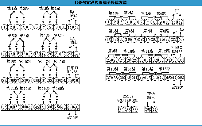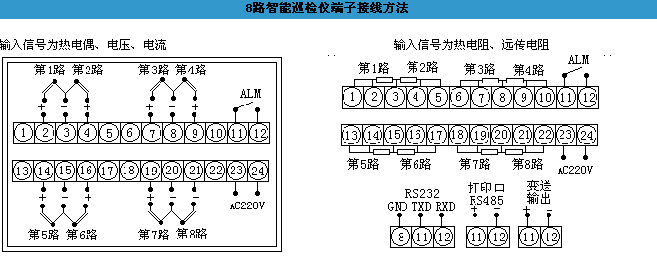 報(bào)警輸出: ⑴1-64通道統(tǒng)一上下限報(bào)警,繼電器輸出觸點(diǎn)容量 AC220V/3A